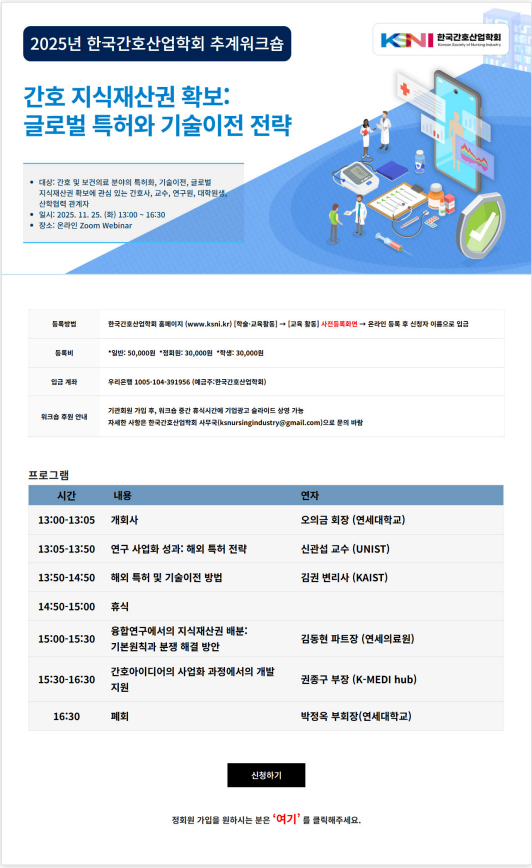 “간호 지식재산권 확보: 글로벌 특허와 기술이전 전략” 이라는 주제로 2025년 추계워크숍을 개최하고자 합니다.이번 워크숍에서는 해외 특허 전략 및 기술이전 방법부터, 융합연구에서의 지식재산권 배분과 분쟁 해결 방안 같은