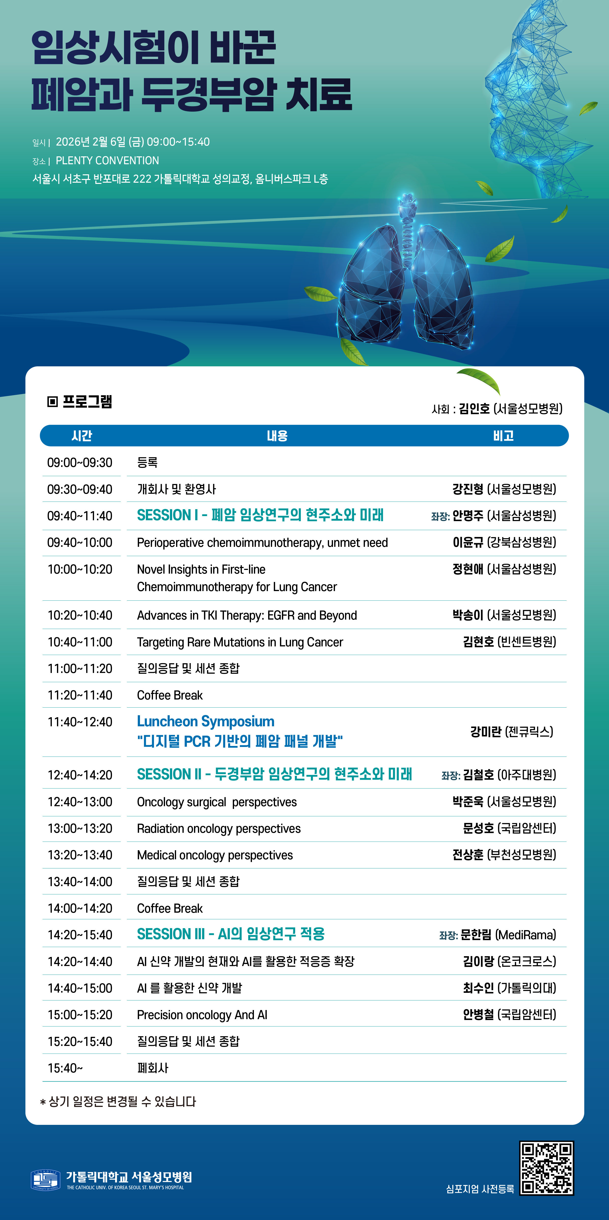 2026년 02월 06일 서울성모병원 Plenty convention에서 가톨릭의대 내과학교실과 서울성모병원 종양내과에서 주최하는 임상시험이 바꾼 폐암과 두경부암 치료 심포지움을 개최합니다.